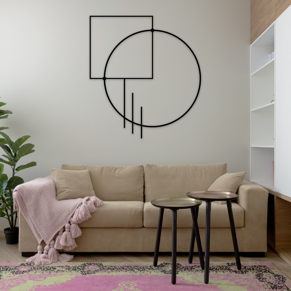 Geometrický kovový obraz – kruh a čtverec spojuje dva základní geometrické tvary do harmonického a moderního designu. Kombinace kruhu a čtverce vytváří dynamický vizuální efekt. Proto dodá každému interiéru jedinečný charakter.